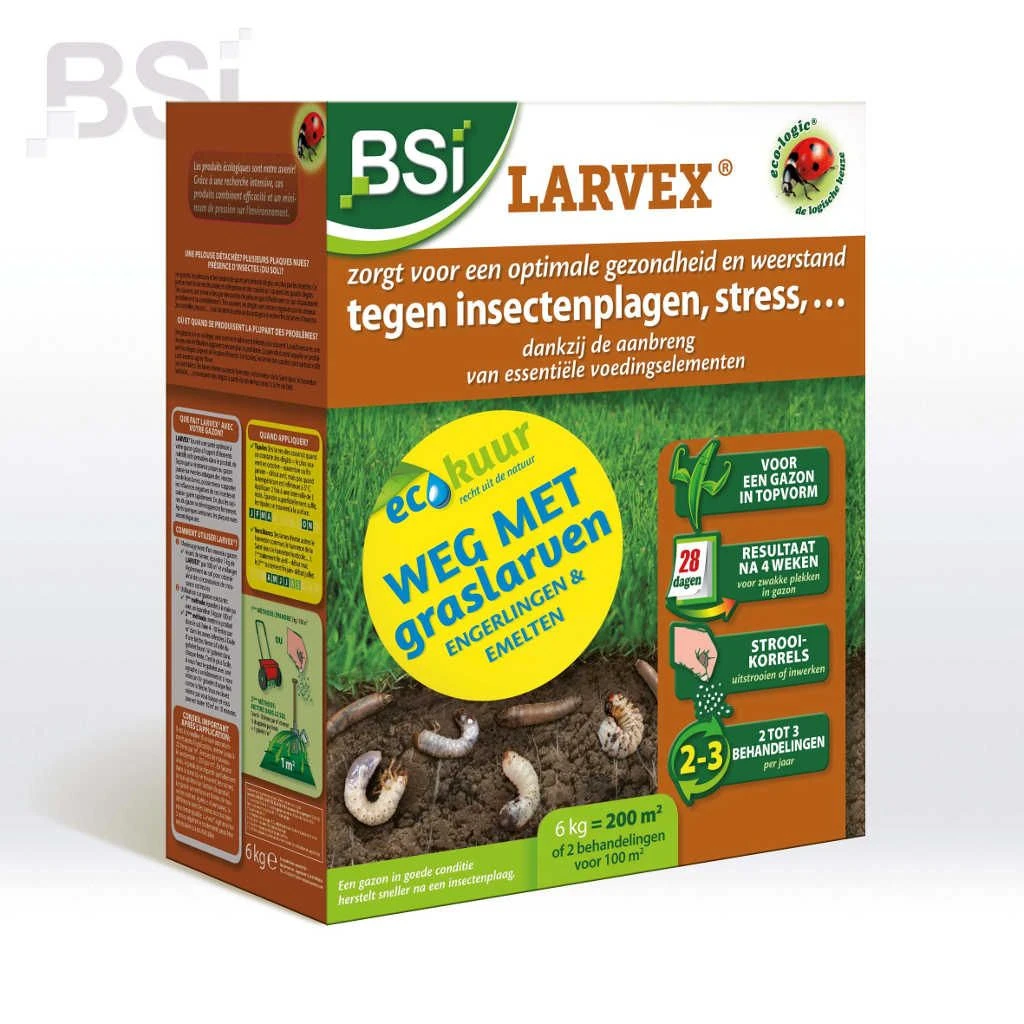 LARVEX verdrijft op een ecologische en bijzonder krachtige manier engerlingen, emelten en andere bodeminsecten. Dit product heeft een complexe samenstelling met uitsluitend natuurlijke grondstoffen. Larvex verhoogt de planteigen weerstand van het gazon tegen de nadelige gevolgen van bodeminsecten. Door sterke stimulatie van de grasplant, onder meer door toegevoegde voedingselementen, gaat het gazon een krachtig nieuw wortelstelsel ontwikkelen. 3 à 4 weken na de behandeling groeit het gazon opnieuw keurig dicht.