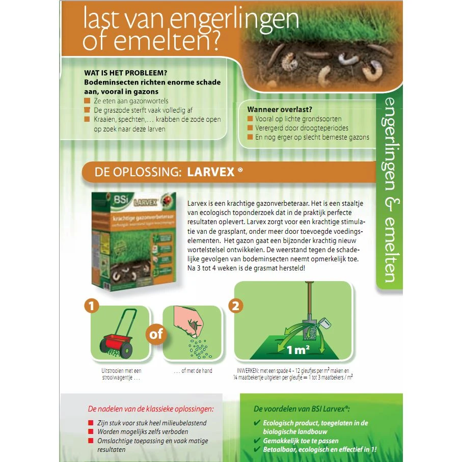 LARVEX verdrijft op een ecologische en bijzonder krachtige manier engerlingen, emelten en andere bodeminsecten. Dit product heeft een complexe samenstelling met uitsluitend natuurlijke grondstoffen. Larvex verhoogt de planteigen weerstand van het gazon tegen de nadelige gevolgen van bodeminsecten. Door sterke stimulatie van de grasplant, onder meer door toegevoegde voedingselementen, gaat het gazon een krachtig nieuw wortelstelsel ontwikkelen. 3 Ć 4 weken na de behandeling groeit het gazon opnieuw keurig dicht.