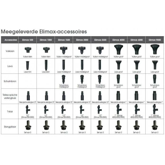 De Ubbink Elimax 6000 word geleverd inclusief aansluitmateriaal en 3 sproeikoppen. Bij de Elimax 6000 zit een vulkaan sproeikop, waterbel sproeikop en een schuimbron. Bij een fonteinpomp moet je goed rekening houden met de grote van je vijver, neem je een te grote fonteinpomp dan zou het water naast de vijver terecht kunnen komen. Voor de Elimax 6000 moet de diameter minimaal 220 cm zijn. De Elimax-fonteinpompen zijn gemakkelijk in gebruik.
